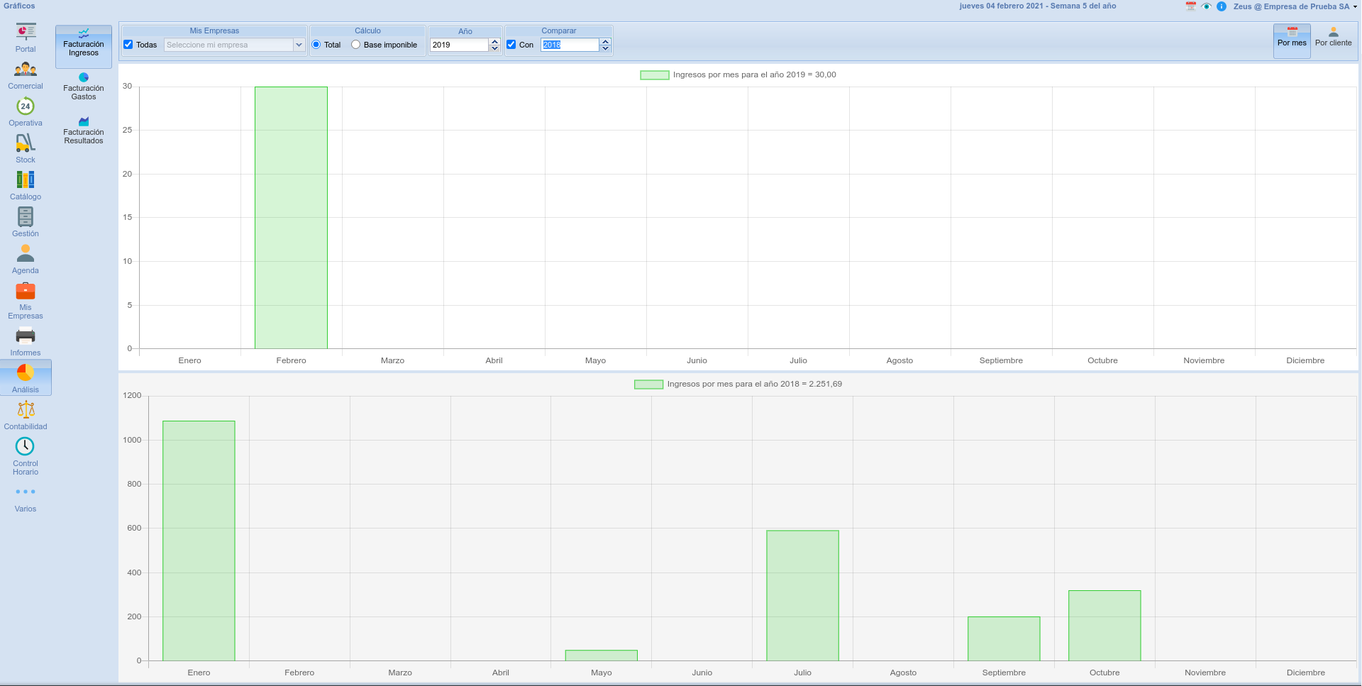 Se ha recuperado, rediseñado y modernizado la sección completa que maneja diferentes resultados y gráficas sobre la evolución mensual y anual por cliente o proveedor de los resultados financieros de cada empresa.